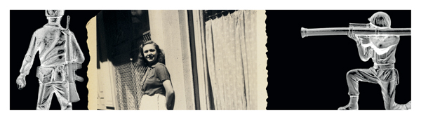 Somewhere Between Life and Death juxtaposes images of toy soldiers with World War II era found imagery of women. It visually explores the choices war poses to an individual, as well as illuminates the everyday relationships that global conflict disrupts and often destroys.